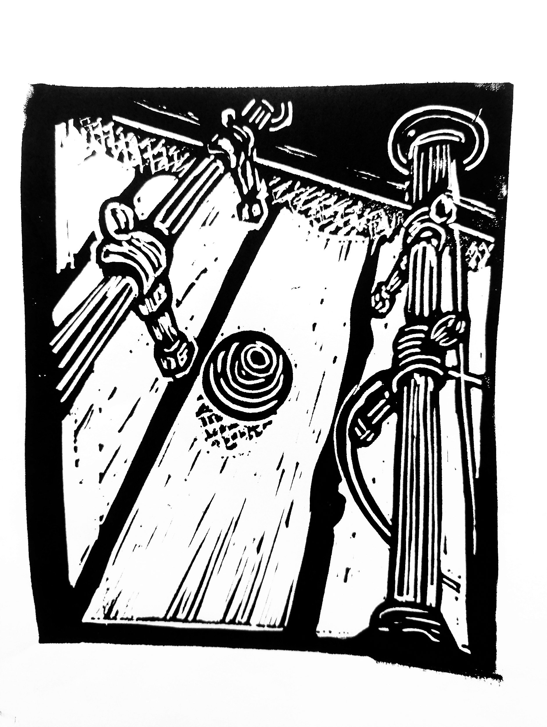 Uma obra exclusiva em linogravura que traz a representação detalhada de uma partida de totó, capturando movimentos e a energia do jogo.
